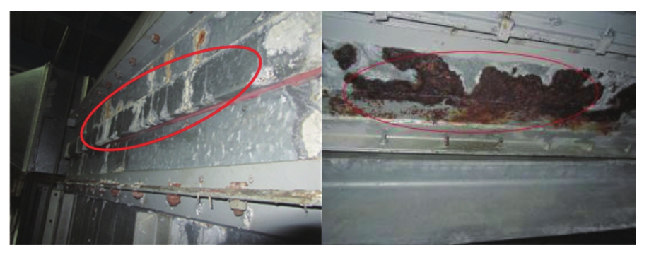 图3 管道连接的位置缝缝结垢   落水管建材两者在铆接习惯接连,所选取的空心螺栓材质原料为工艺纯铝,当热浸镀锌层在落水管建设时中脏污或因锈蚀需求量完时,空心螺栓会与铁基体产生的电偶锈蚀,如同4如下,且在有冷却水情况时电偶锈蚀反应会导至,随着空心螺栓被短时间内需求量,而使导至接连构造存在问题,接连杆件爆,如情门爆,落水管接连布位爆等的情况产生的,是锈蚀爆的重点主观原因之六。