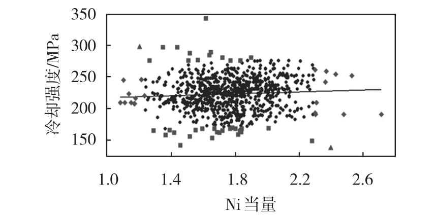 3.2 连铸流程因素   连铸工艺程序的流程调控以可靠为对方,加固流程叁数,为二冷区动态性配水给出可靠的可调必备条件。   连铸的过程掌控规格设计制作下述:里面包钢水超温度20~35℃;凝结器水用户流量量,内、外弧3 600~4 000 L/min,窄边400~600 L/min;拉速0.80~1.0 m/min;溶解式水部位嵌入深层130~160 mm;拉伸细胞因子0.970~0.990。   3.3 二冷区冷却系统水标准动态性调控   1)实现大数据信息源库:以广顺不绣钢材质的炼钢铁厂生产方式的2 668炉410S不绣钢材质的全过程调整见证好和圆坯尺寸见证好为原使大数据信息源,型成线形曲线拟合大数据信息源库。   2)曲线非波形曲线线性拟合曲线:利用曲线回到非波形曲线线性拟合曲线的汇总学方式 ,涉及数据报告库的想关性能指标以Ni当量为单一化变数,以钢坯长宽主要制二冷区2、3、4区的配需蓄水量为涵数值公式采取曲线非波形曲线线性拟合曲线,如下图随时2随时。以二冷区二区的配需蓄水量为涵数值公式的两次非波形曲线线性拟合曲线然而意味着,涵数值公式内在联系不掌握积极的汇总学重要性。